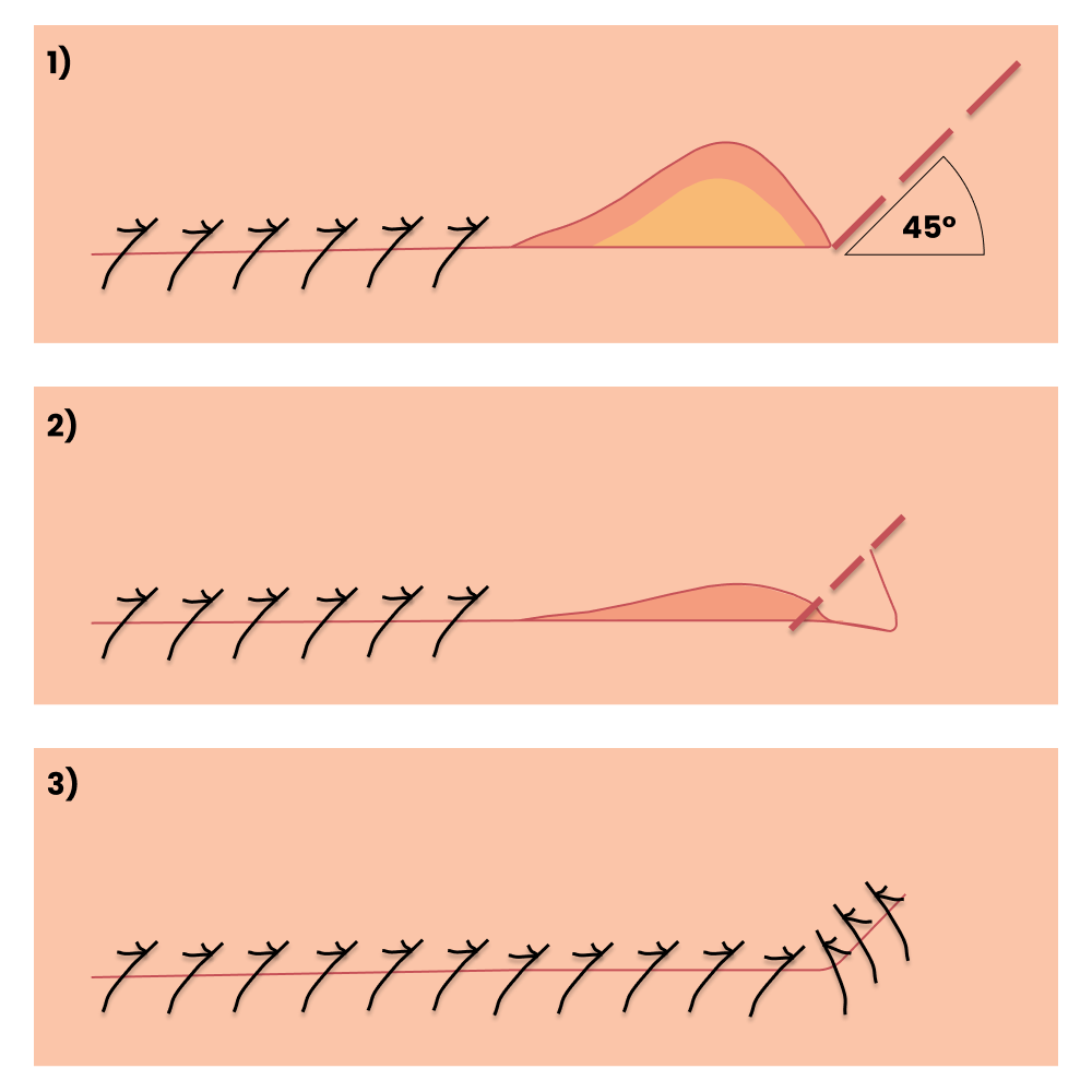 - Incise the skin at the apex of the wound, approximately 45 degrees relative to the line of the wound, in the direction of the dog ear. This will free the excess tissue.